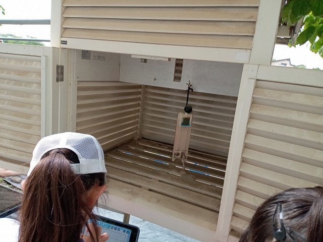 午後11時30分、百葉箱に行ってみるとしっかり計測し記録する姿がありました。