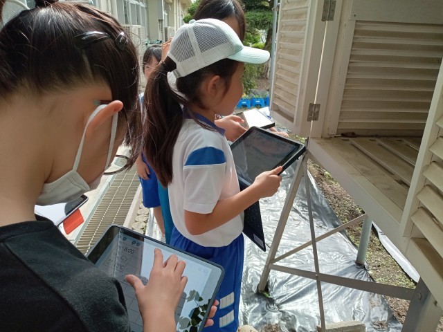 朝8時、百葉箱の中の気温計を確認し、気温を計測してタブレットに記録していました。
