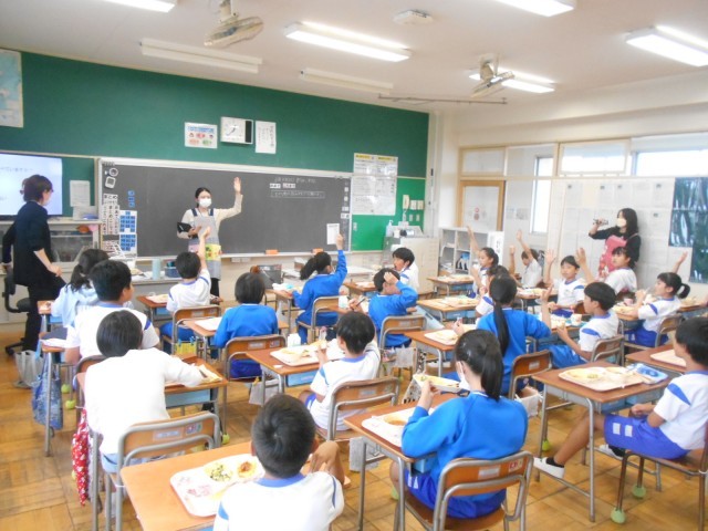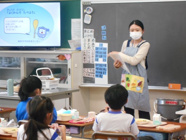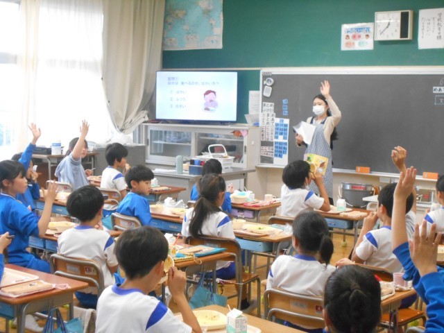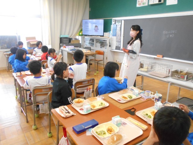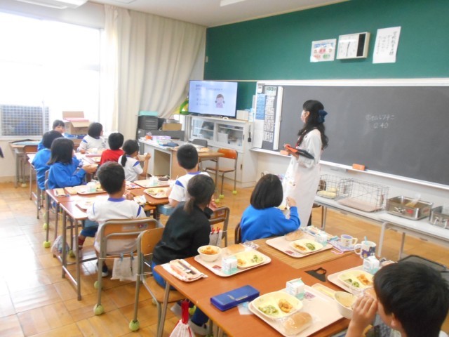 4年生では、今日の給食の時間に学校栄養教諭の先生と給食センターの栄養士さんをお迎えし、食育指導をしていただきました。