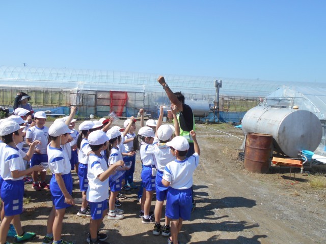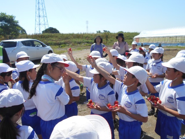 快晴のもと、子どもたちは元気にいちごハウスに向かって出発しました。