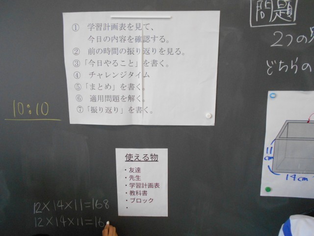 今日は、昨日まで学習してきたことを踏まえながら、容積の課題にチャレンジしていました。今回のテーマである自分の選んだやり方で、いろいろなものを使って、様々な場所で取り組んでいました。
