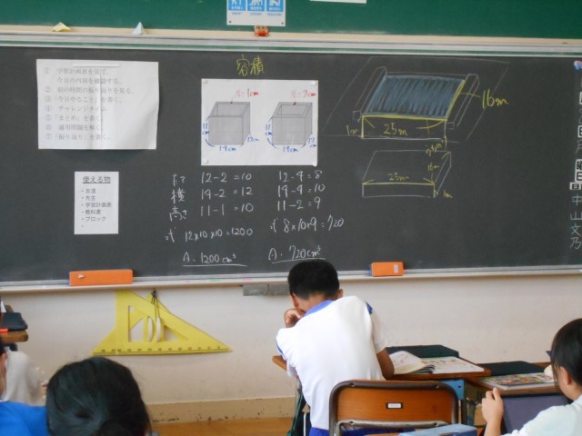 お知らせいておりますとおり、5年生では、5月26日から総合教育センターで授業づくりについて研究している本校の先生が「体積」の授業を行って来ました。