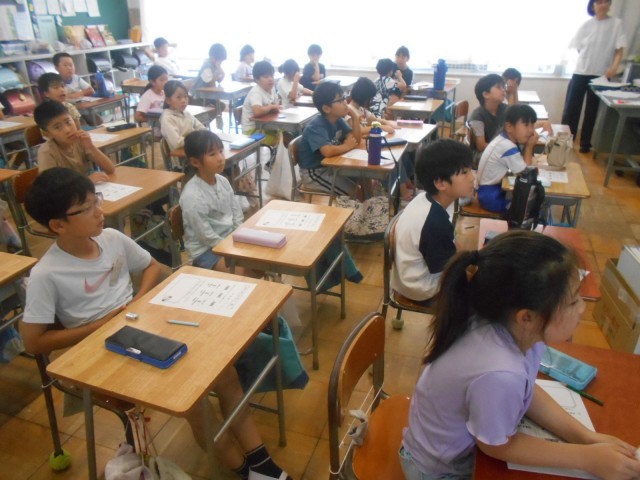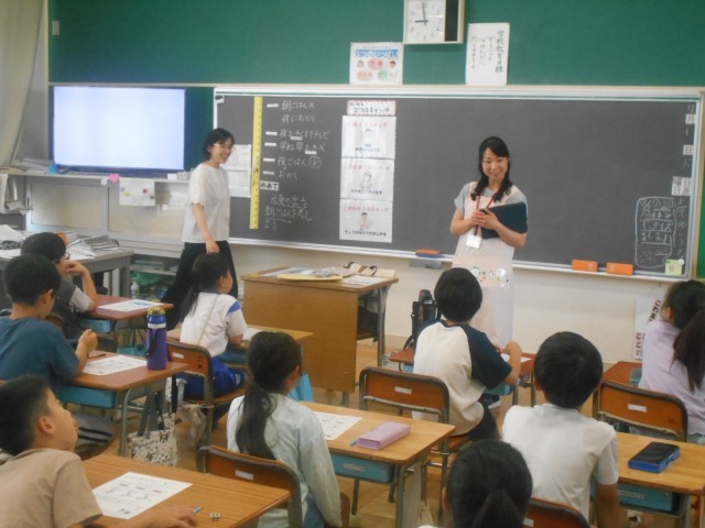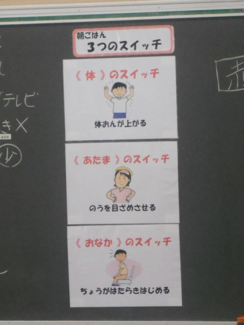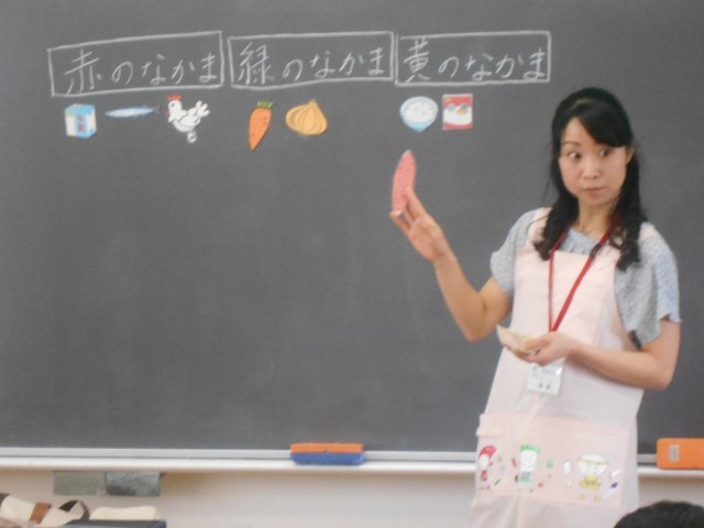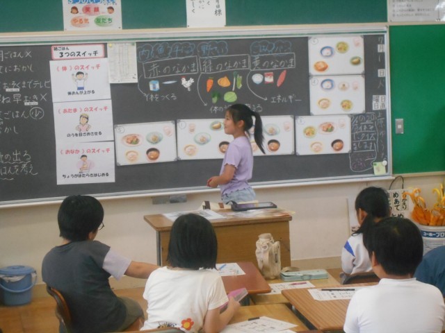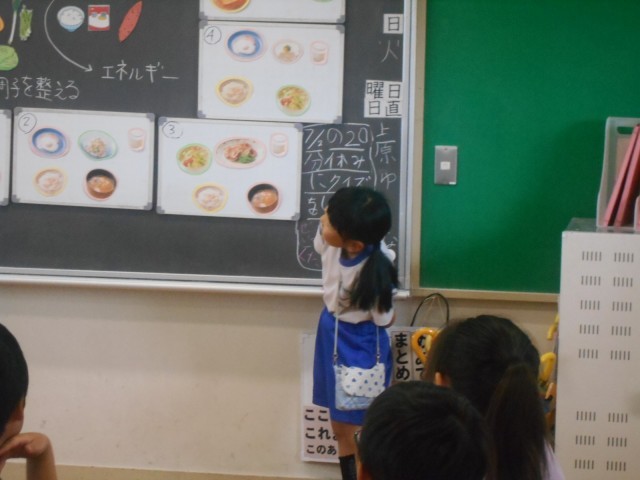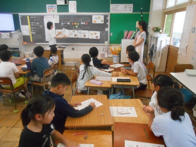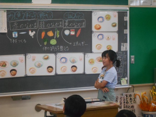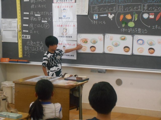 今日は、藤岡市の栄養教諭の先生をお迎えし、「元気の出る朝ごはんを考えよう」というテーマでお話をしていただきました。「(朝ごはん)3つのスイッチ」や食品の3色分類を教わり、実際の給食のメニューを分類してみました。好き嫌いをせずに、3つの分類された食べ物をバランスよく食べること、特に野菜を食べることの大切さについて教えていただきました。
