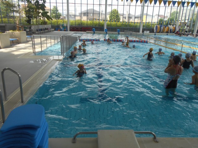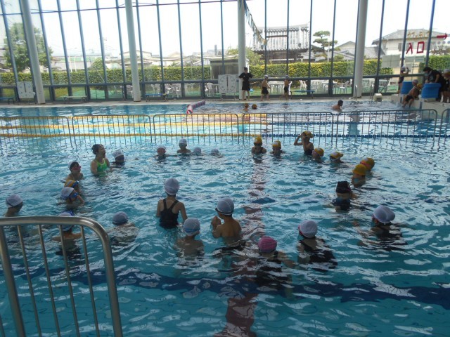 今日から7月に入りました。今日も猛暑日、8時30分の外の気温はすでに33度を超えています。そんな中、1年生の皆さんは、はみずとぴあの指導員さんにお世話になって、2回目の水泳の授業が始まりました。