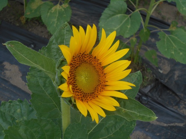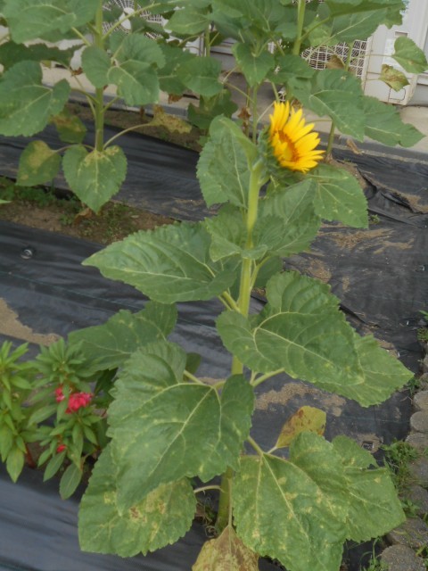 今朝、3年生の花壇に行ってみると、大きく成長してきたひまわりが一つ花を咲かせいぇいました。