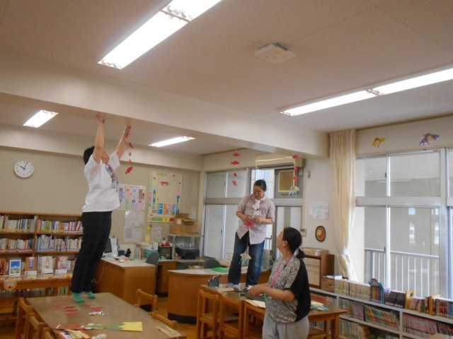 本日の午前中、図書室では図書ボランティアの皆さんが集まり、図書室に行きたくなるような季節に因んだ掲示物の飾り付けをしてくださっていました。