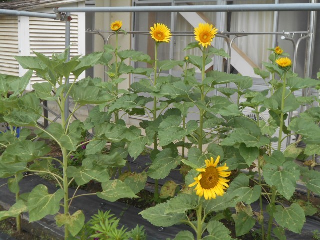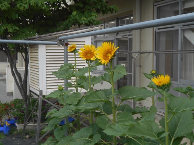 金曜日にの朝、ひまわりが一つ花を咲かせたとお知らせしたところですが、今朝花壇にいくつものひまわりの花が、太陽の方に向かって元気に花を咲かせていました。