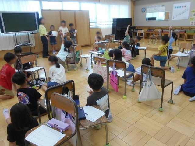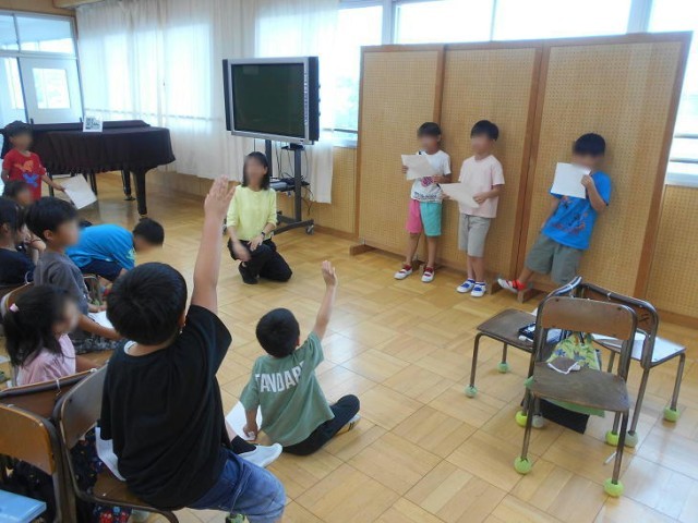 音楽で、動物の鳴き声で発表するグループの友達が、どんな動物の鳴き声で発表しているのか当てていました。
