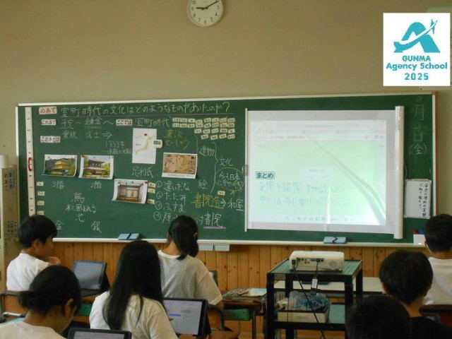9月26日(金)授業の様子(6-2) 公開日 2025/09/26 更新日 2025/09/26 できごと 社会で「室町文化」について、学習していました。 金閣と銀閣の違いは…。 書院造りをよく見ると…。 墨絵は何色…。 自分で考え、みんなで交流し、新たな発見をしながら学びを進め、 「室町文化には、金閣や銀閣、すみ絵などがあり、中には、今に受けつがれているものがある。」 と、自分たちの言葉でまとめていました。 +2