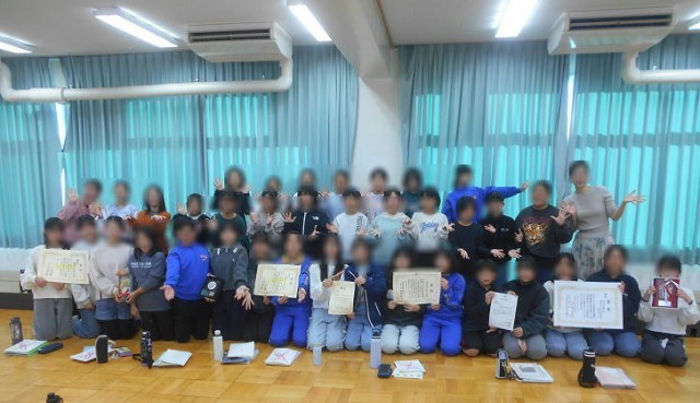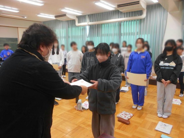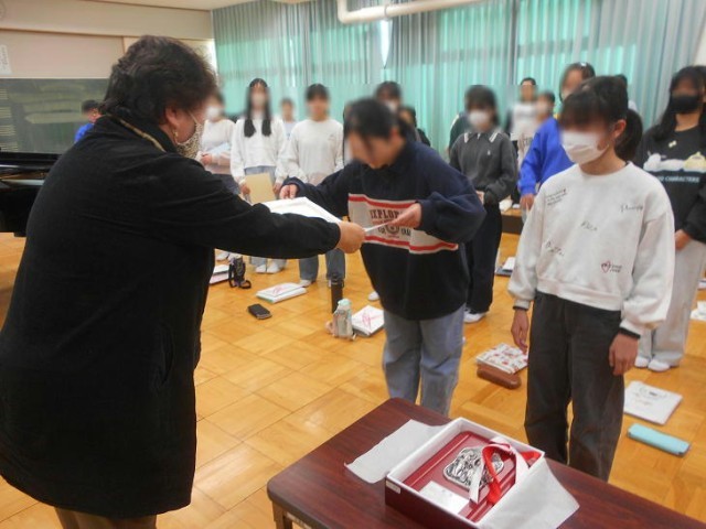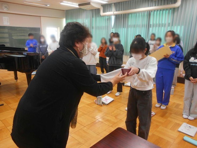 12月4日(木)表彰4 公開日 2025/12/04 更新日 2025/12/04 できごと 放課後、これまでできていなかった合唱部の表彰をしました。 たくさんの賞状を見ると、それぞれの大会の素敵な歌声がよみがえってきました。 合唱部のみなさん、改めて、おめでとうございます♪ +2