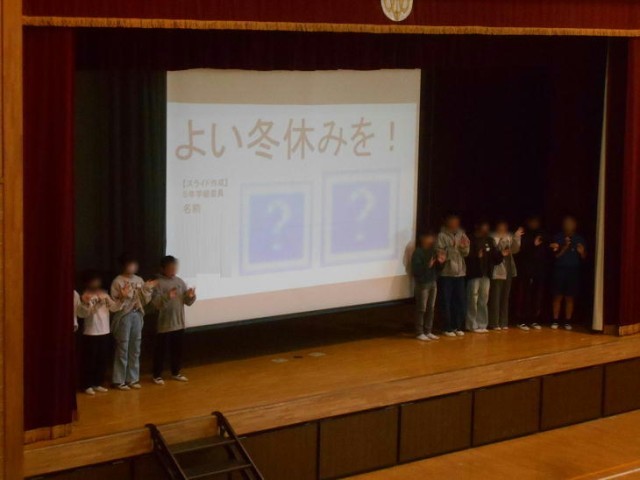 終業式後、5・6学年学級委員さんから、2学期の振り返りと冬休みのすごし方について話がありました。