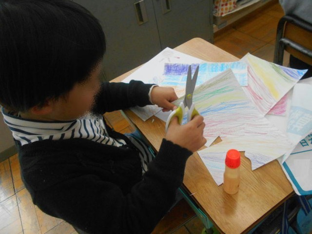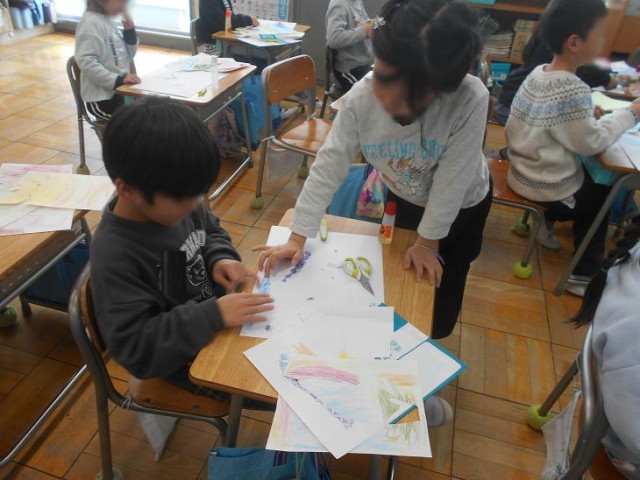 1月14日(水)授業の様子(1-1) 公開日 2026/01/14 更新日 2026/01/14 できごと 図工で「こすり出したかたちから」の作品制作をしていました。 こすり出した紙の「もよう」や「いろ」を活かしながら、自分がイメージした世界を切り絵で表していました。 よさを伝え合いながら楽しく活動していました。