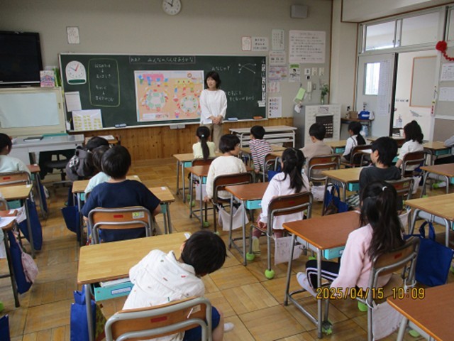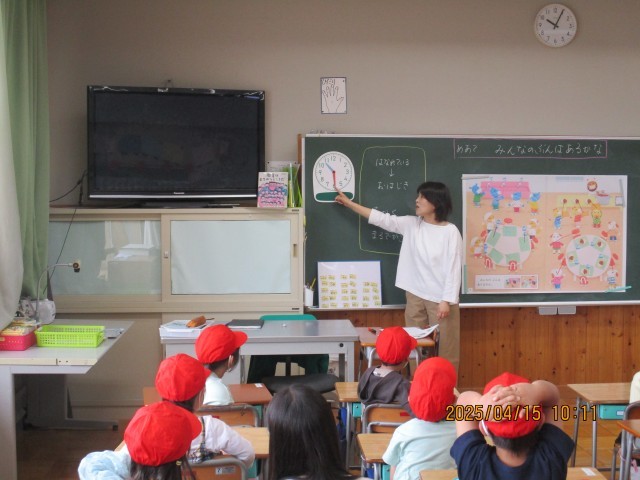 1年1組では、算数の「みんなのぶんはあるかな」の学習をしました。しっかり先生の話を聞けて、学習態度が素晴らしかったです。授業の最後には、休み時間の過ごし方について、時計を使って話がありました。学校生活のひとつひとつが勉強になります。