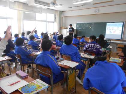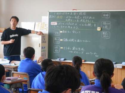 「わたしたちの生活と政治」の学習が始まっています。「ここでは」政治とは何か?私たちの暮らしと政治との結びつきを考えます。ちょうど教室では、学生やお年寄りなど、様々な人たちの立場にたって、それぞれの願いを考えて意見を出し合っていました。意見とともに黒板に示されるのは、児童の名前が書かれたネームプレートです。このあと全員のネームプレートが貼られていきます。小野一貫校の授業では、全児童がこうして授業で活躍しています。