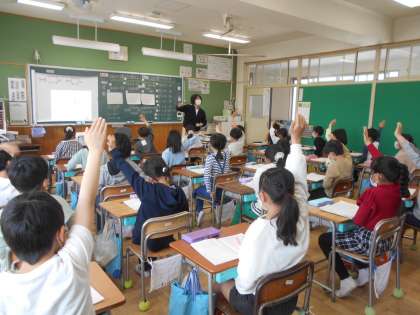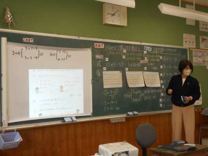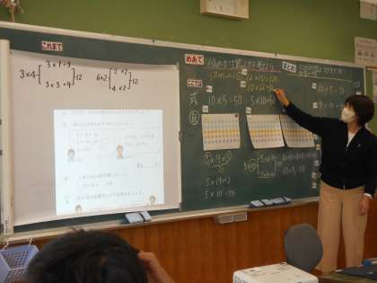 「かけ算」の学習では、10のかけ算の仕方を考えていました。ちょうど教室では、今日学んだことの理解と定着を目指して、先生問題を解いていました。児童は皆、とてもすらすら解くことができ感心しましたが、さらに感心なことに、チャレンジ問題も解けてしまいました。先生からは、「このあと」学習することだと教えてもらい、さらにこのあとの学習へのやる気が高まりました。このように、児童のやる気も学ぶ内容も、いつでも、どの教科でも、つながっています。