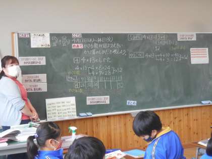4月14日(金)3年生 算数 公開日 2023/04/14 更新日 2023/04/14 できごと かける数が10より大きいかけ算の仕方を考えていました。友達の考えにはしっかり耳を傾けて、自分の考えと比べて反応します。新しい学級との出会いから1週間。日に日に、友達と一緒に学びあう学級つくりが充実しているのを感じています。職員のやる気はもちろんですが、学習の主役である児童のやる気が大変素晴らしいからだと感じている今日この頃です。