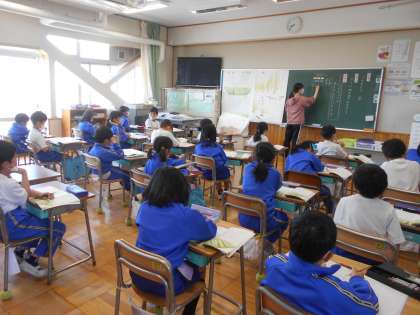 「ふきのとう」今日のめあては「とうじょう人ぶつの気もちをかんがえよう」です。じっくり考えて発言しており、黒板に一人一人の考えたことと名前がどんどん貼られていくところでした。このあとは、登場人物の気持ちを考えながらの音読が待っています。毎日一生懸命取り組んでいる音読もどんどん上手になっていきます。