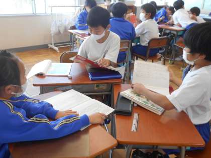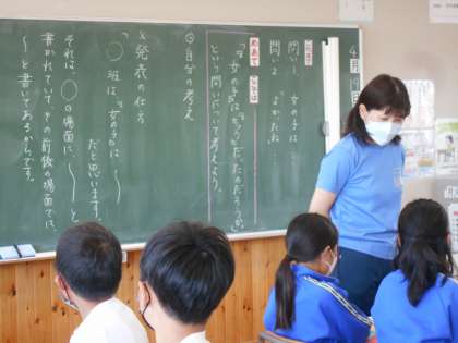 4月19日(水)4年生 国語 公開日 2023/04/19 更新日 2023/04/19 できごと 「白いぼうし」を学習しています。「女の子はちょうだったのだろうか?」自分の考えをノートにまとめたあとで、友達と交流していきました。ただなんとなくそう思ったからではなく、「ここでは」その問いとつながりそうな場面や表現に着目して読むなどして、叙述をもとに内容を捉えることを学びます。