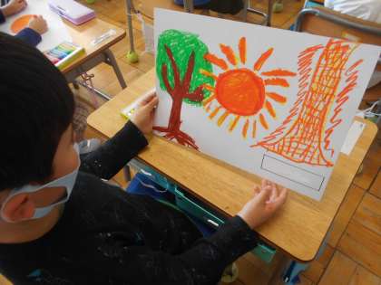 4月19日(水)1年生 図工 3組 公開日 2023/04/19 更新日 2023/04/19 できごと たのしいおひさまを嬉しそうに見せてくれます。どんな気持ちでかいたのかな?これはなにかな?質問をしてみると一生懸命説明して聞かせてくれます。ちゃんと伝わりました。