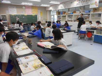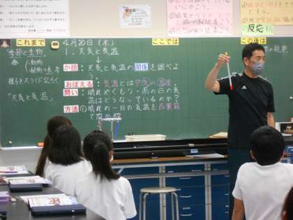 4月20日(木)4年生 理科 公開日 2023/04/20 更新日 2023/04/20 できごと 「天気と気温」の学習が始まりました。「ここでは」晴れの日や曇り、雨の日、それぞれの日の気温と天気との関係について学習します。そのために、1日の気温の変化を調べる必要があります。そこで「百葉箱」のことを知りました。実際に見てみます。クラスの中には「知っています!」という児童もいました。「2年生の畑の近くにあるのは知っている!」何なのか気になっていたことも今日分かったようです。