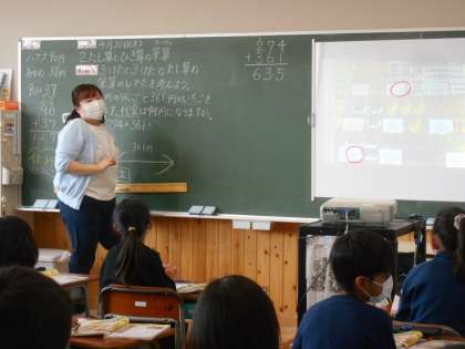 新しい学習に入りました。「たし算とひき算の筆算」の学習です。274円のりんごと361円のいちごを買いました。代金はいくらですか?「これまで」2年生の時には、テープズを使って学習しました。また、筆算の仕方も基本的なことは学習しています。そのような「これまで」の学びを思い出して、「できそう!」と3年生の児童は思っていました。先生はそのような児童の発言を「なるほどね」と感心して聞いていました。