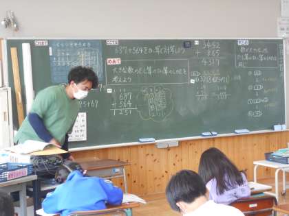 4月24日(月)3年生 算数 公開日 2023/04/24 更新日 2023/04/24 できごと 2組と3組の算数の授業の様子です。どちらの教室も、大きな数のたし算の筆算の仕方を考え、「ふりかえり」で問題を解いていました。2クラスともかなりの集中力で、足音をたてるのが申し訳なく思うくらいでした。数が大きくなっても「これまで」の学習のように、同じ考えで計算する!自信をもってこのあとの学習に進んでいけると思います。