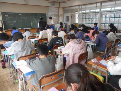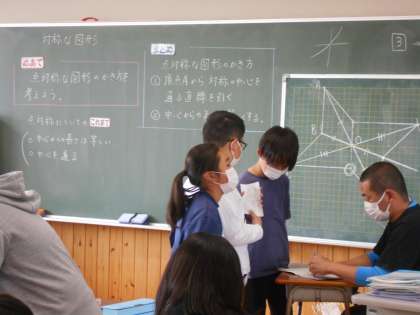「対称な図形」を学習しています。今日は、点対称な図形のかき方について考えていました。ちょうど教室ではふりかえり問題に挑戦し、先生にみてもらっていました。これまでにもいろいろな形を数多く学習してきました。「ここでは」線対称や点対称の学習を通して、形の見方についてどんどん考えを広げていきます。