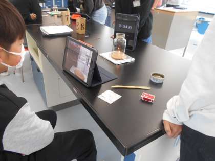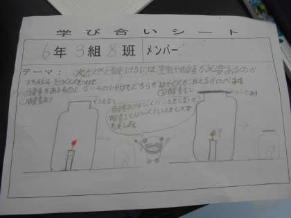 「ものの燃え方」の学習です。ものが燃え続けるために必要なのは?児童はいろいろな考えを予想しました。そこで、その予想を確かめるために必要な実験の仕方を班の仲間と考え、実験しました。「これまで」5年生の理科で、様々な学び方を身に付けていますので、担当する中学校の兼務の先生は大変驚いていました。火を扱いますから、もちろん安全第一で、先生の指示をしっかり聞いて、実験に取り組んでいました。課題が自分たちのものになっていますから、しっかり頭を働かせて考えながら学んでいます。