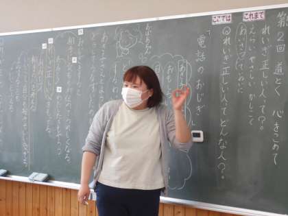 「電話のおじぎ」を通して、礼儀について考えていました。「これまで」2年生までは、気持ちのよい挨拶や言葉遣いなどに気を付けて明るく接することを学んできました。「ここでは」3年生になると、相手の立場を考えたり、誰に対しても真心をもって接する態度の大切さについて考えたりできるようになります。「れいぎ正しい人とは、どういう人でしょうか?」今日は、「見えるれいぎ」と「見えないれいぎ」を考えることができました。
