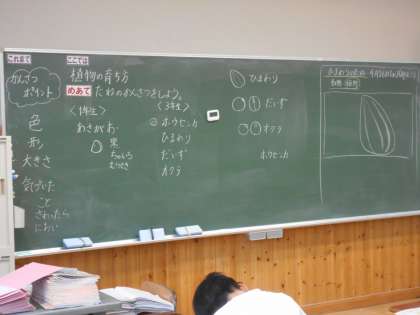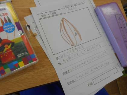 たねまきをして、植物の育ち方を学習します。3年生は初めての理科の学習ですが、「これまで」1、2年生では、あさがおや色々な野菜を種から育ててきました。そして、見たり、匂いをかいだり、さわったり、スケッチしたりしながら観察の仕方も学習してきました。今日は先生からいろいろな種をもらって、観察記録を書いていました。「これまで」の学習が大変よく生かされていました。