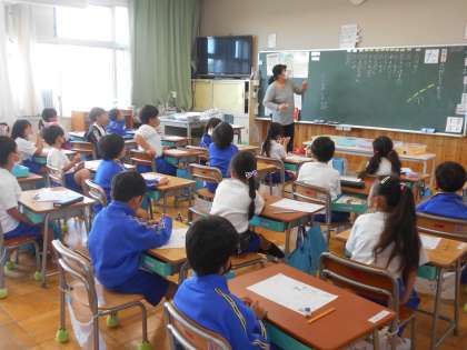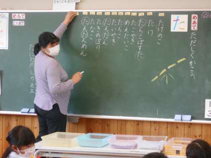 国語では、ひらがなの「た」について学習していました。ちょうど教室では、「た」がついた言葉を発表していました。いろいろな言葉が浮かんできます。そして、発表すると先生にネームプレートを貼ってもらえるのが嬉しくて、またたくさん発表していました。