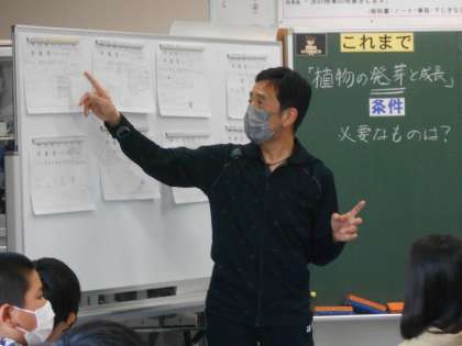 「植物の発芽と成長」の学習に入りました。「ここでは」直物の発芽条件について、インゲン豆の種をまき、発芽の条件について、「変える条件」と「変えない条件」を何にするかを考えました。「これまで」はどんな観察、実験をするか?先生から教えてもらうことばかりでしたが、5年生になると、このように条件を一つだけ変えて、他の条件をそろえて調べる理科の学習が始まります。日光、肥料、空気、土、シャベル、水、植木鉢、温度、草むしり。それぞれのグループでなぜその条件にするのか?きちんと理由がありました。「空気がないって?どうしたらいいのかな?」実験方法も考えました。