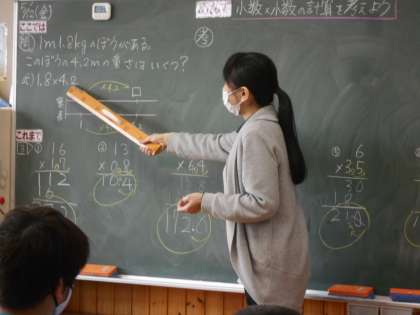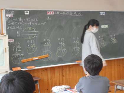 「小数のかけ算」の学習です。「これまで」も整数と小数のかけ算などを学習してきましたが、今日は小数×小数の計算です。「4年生のときにやったぞ!だから今日のはレベル2か?」という児童もいました。先生からは、「まだまだこれからも、中学までずっと続く勉強ですよ!」と聞き、「これまで」やってきたことがあるという自信と「このあとは」に続く大切な「ここでは」の学習だから頑張ろう!というやる気が一気に高まりました。
