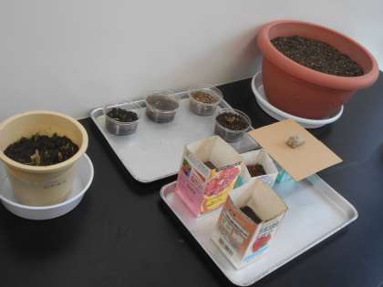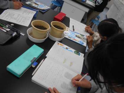 授業のはじめには、発芽条件について調べている自分の実験について、観察記録をとっていました。どの条件を整えて、どのように調べればよいか?を何度も何度も練り直し、じっくりと考えて取り組んでいる実験なので、とても熱心に記録をとっていました。