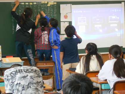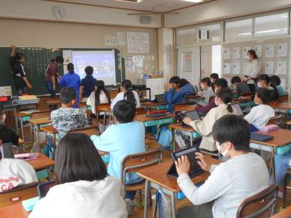 4時間目の3組では、学級活動の時間に、クラスの「シンボルマーク」を決めていました。タブレット上で皆のアイデアを見て、一つに決めます。もちろん、5年生は児童が前に出て主体的な話合いを進めることができます。多数決で決めれば簡単です。でも、5年生はそうではありません。しっかり皆の考えを理由とともに聞き、話合いを進めます。また、話合いのなかで、2つのアイデアを合体するアイデアも出てきました。皆の意見が尊重され、自分も皆も納得いくような話合い(合意形成)ができる5年生です。よい話合いを進めていたので、私(教頭)は、教室から離れられませんでした。とても感心しました。