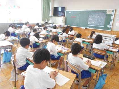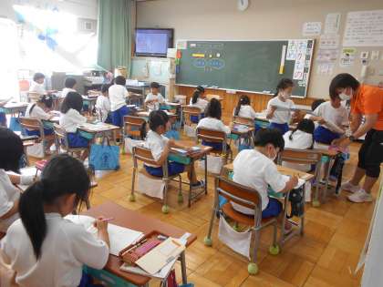「7はいくつといくつ?」ブロックやおはじきを使って考えています。ノートに書いた自分の考えを先生に見せて丸をつけてもらっています。このあと10まで学習し、「あわせていくつ ふえるといくつ」いよいよたしざんの学習に入ります。そのために大切な学習をしています。