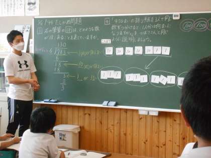 5月18日(木)4年生 算数 公開日 2023/05/18 更新日 2023/05/18 できごと 3けた÷1けたのわり算の計算について、確かめ問題に挑戦する時間でした。ちょうど教室では、発表した児童の説明が大変分かりやすく、先生がとても感心していました。しっかりと学習内容が自分のものになっている証拠です。