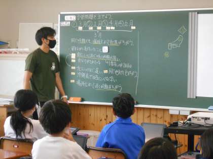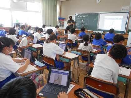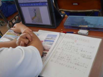 「ここでは」日本国土の気候の特色について学習します。教科書、資料集、タブレット上から示された資料を見て、その資料から分かることを皆で共有しあっていました。ちょうど教室では、桜が咲き始める時期についての資料について、場所によって違うことなどを話していました。また、梅雨や台風、四季の変化、地域によって異なる気候なども学習します。机の上にはノート、教科書、筆記用具、資料集、タブレット。それぞれうまく活用しながらしっかり学習に励んでいる5年生です。
