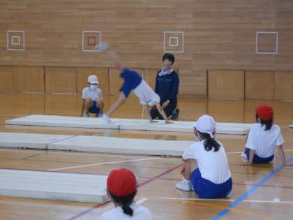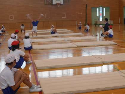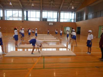 5月23日(火)4年生 体育 公開日 2023/05/23 更新日 2023/05/23 できごと 体育館でマット運動をしていました。今日は側転にチャレンジです。時には、友達の側転をお手本にしながら頑張っていました。また、友達や先生がよくアドバイスをしてくれています。安全に学習が進むように、皆が集中して頑張っていたので、「よしやるぞ!」という雰囲気が漂っていました。
