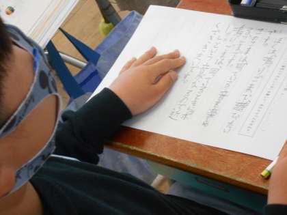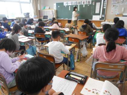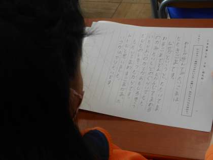 「こまを楽しむ」の学習もいよいよまとめです。「ここでは」段落とその中心をとらえて読み、感想を伝え合います。今日はここでの学習を通して、自分が一番遊んでみたいと思うものを選んで理由とあわせて感想を書いていました。同じこまを選んでも友達によって理由が違うということに気付くのも、伝え合うことの楽しさです。