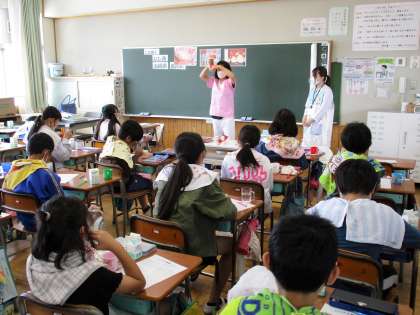 5月24日(水)5年生 藤岡市出前講座「健康な歯をつくろう」 公開日 2023/05/24 更新日 2023/05/24 できごと 2校時目に5年生の各学級で、標記の講座を行いました。藤岡市より、歯科衛生士さんと保健師さんをお招きし、むし歯と歯周病について話していただきました。特に高学年の児童に起こりやすい思春期の歯肉炎について触れ、歯周病に対する知識と予防のためのブラッシング方法について詳しく教えていただきました。子供たちは熱心に話を聞き、ブラッシングの練習をしました。