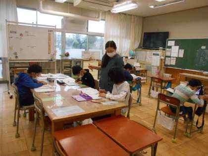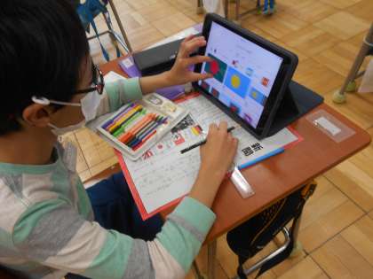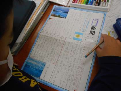 6年生は総合的な学習の時間で、世界遺産について学習をしています。2人の児童はそれぞれ自分の関心のあることをテーマにして調べ学習を進め、それを1枚の新聞にまとめています。皆によく伝わるように、レイアウトや文章を考えながら、見事なできばえです。一人の児童は、ある氷河について取り上げ、美しい景観を守るために、また地球温暖化を防ぐために調べています。もう一人の児童は、国旗や世界の国々に関心が高く、日本の国旗と似ている国旗の国、その国のことを詳しく調べていました。なかなか面白いテーマです。