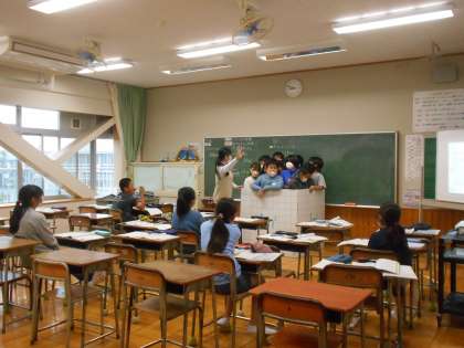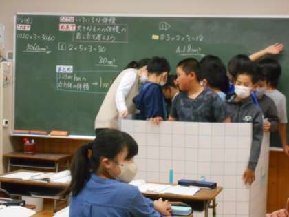 「体積」の学習では、大きなものの体積の表し方を学習しています。楽しそうな場面を見ました。この立方体の中に何人の児童が入るだろうか?1立方メートルの立方体の大きさを実際に体で感じていました。立方センチメートルの単位で表すよりも簡単であり、大きさが分かりやすくなることもあるでしょう。