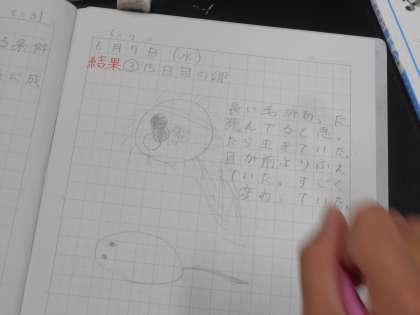 6月7日(水)5年生 理科 公開日 2023/06/07 更新日 2023/06/07 できごと 「メダカの誕生」今日は15日目の卵の観察です。いくつかの班では、もう生まれて元気に動いているメダカの赤ちゃんが見られました。双眼実体顕微鏡で観察していても、元気に動き回るので、虫眼鏡で見ている班もありました。ずっと観察しているので、学習内容が身に付くだけではなく、愛着もわいてきて、生き物の生命を大切にしようとする気持ちも育っています。