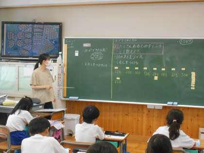 6月7日(水)2年生 算数 公開日 2023/06/07 更新日 2023/06/07 できごと 「100より大きい数」新しい単元の学習に入りました。教科書には、たくさんの魚が泳いでいます。その魚の数をどうやって工夫して数えるのか?考えていました。10のまとまりをつくって考えることのよさを知りました。
