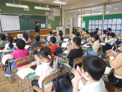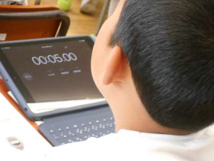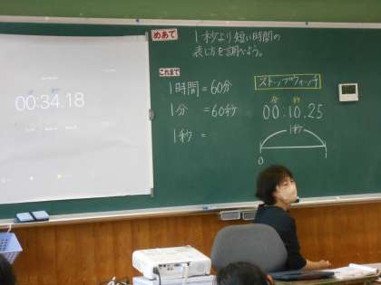 「時こくと時間」の学習です。「ここでは」時刻や時間の求め方、秒の単位について学習するのですが、今日1組では、1秒よりも短い時間の表し方を調べていました。きっと、もっと気になって調べたくなってしまったのでしょうか。1分は60秒、1秒は?タブレットのストップウォッチ機能を使ったり、教室の時計を見たりして、1秒ずつ手をたたいてみたけれど、それよりも短く1秒以下の数字の動きを手で叩くにはついていけませんでした。こうして、時刻や時間について関心が高まっていくことで、生活の中で役立つことがあることでしょう。ちなみに、「5秒でストップ」の課題を見事成し遂げた児童がいました。(写真下)4秒99の児童もいました。