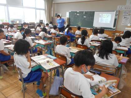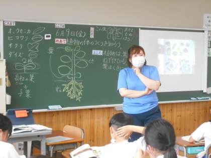 ちょうど教室では、色々な野菜について、野菜の体のどの部分を食べているのか?葉?根?茎?そんな興味深い話題から、3年生の疑問はどんどん膨らみます。「同じイモでも、ジャガイモは茎、サツマイモは根を食べている。なんでかな?」「自主学習で調べてみようかな」「本で調べてみようかな」週末に調べてみたいことがあるようです。こうやって児童の学習への興味・関心は広がっていくのですね。後で、調べたことを教えてね!
