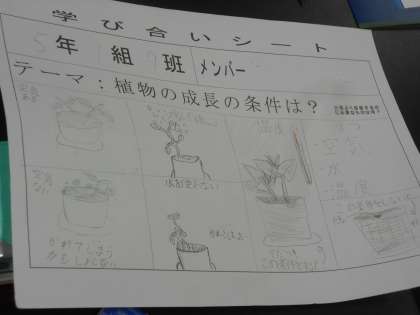 「植物の成長の条件」について学習します。「これまで」発芽条件を調べて学んでいます。今日は、班で「学び合いシート」を囲み予想した条件をその理由とともに発表しました。そして大事なのが、4月から大切にしている「反応」です。友達が考えた予想に対して、自分はどう思ったか?自分が思いつかなかった新しい考えだなあ。自分はそう思わないけどな。授業でいつも大事にしている「学び合い」とは、そういうことをしっかり友達に伝えて、課題に対して一緒に考えていくことです。