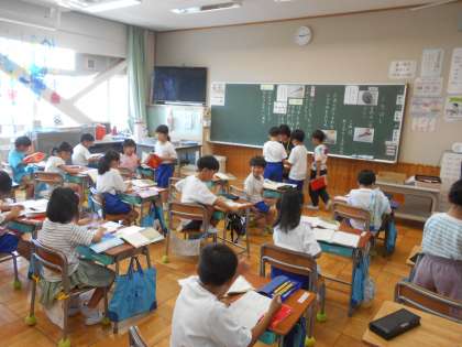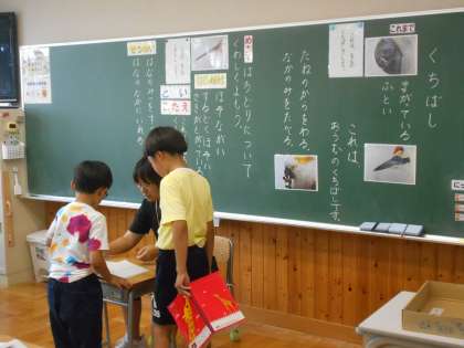 「くちばし」の学習に入りました。今日は、「はちどりのくちばし」について読み取りをしました。「ここでは」初めて説明文と出会い、「とい」「こたえ」について学習しています。「なんだか、さんすう みたいだな」とつぶやく児童がいました。教室では先生にノートをみてもらっていました。鳥のことをもっと知りたい!と図書室から鳥の図鑑の本を借りて読んでいる児童もいました。