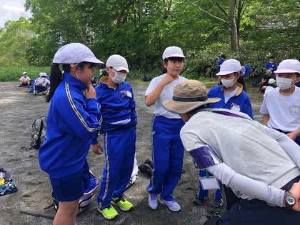 「鳩待峠に戻ってきました。ガイドさんに行きで説明を受けたことを帰りは問題を出してもらいながら、楽しく帰ってきました。2枚目の写真は、今日の学習で感激したことや楽しかったことをお話ししています。これから帰校します。」